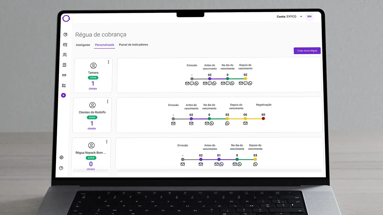 Régua de Cobrança Inteligente: A Neofin oferece uma régua de cobrança que permite a definição de uma cadência personalizada de cobranças. É possível configurar disparos automáticos para serem enviados antes, no dia ou após o vencimento da fatura.
