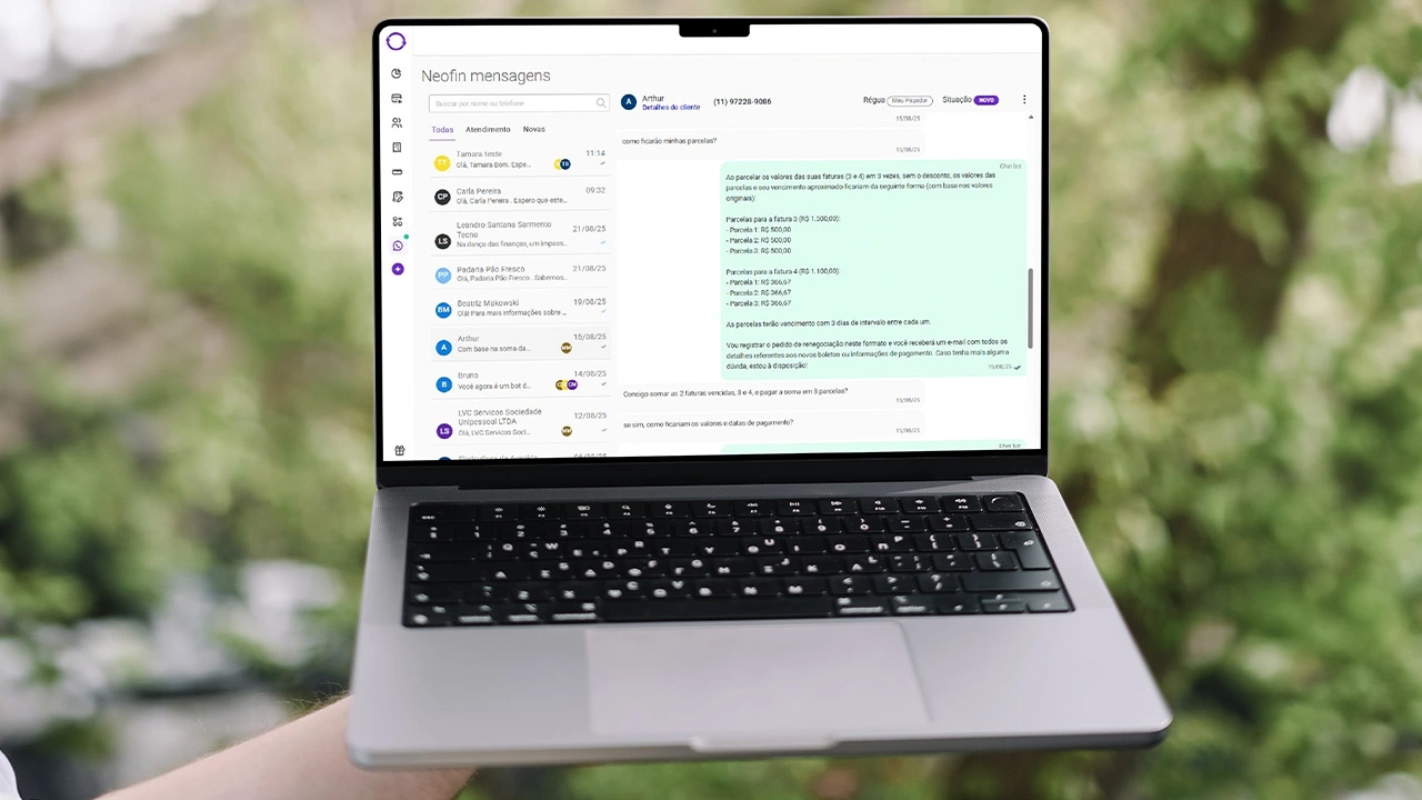 Responda todas as mensagens diretamente pela plataforma Neofin, sem dependência do WhatsApp Web.